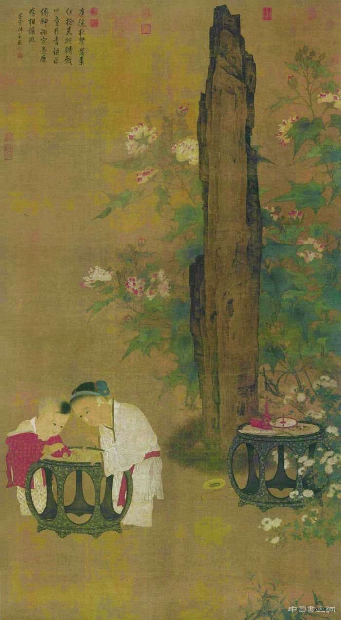 庭院深深深几许,此刻,再高的院墙也挡不住带着丝丝凉意的秋风翻墙而至。假山兀自立在那儿,像是一位老者正在喜滋滋地看着孙子孙女玩游戏;高处大朵艳丽的芙蓉花与地处细碎洁白的菊花,影射着画面的两个主人公一大一小和谐天意之愿景;孩童的玩具、服饰、发型、首饰、家具,无不使观者历历在目,大有如临其境之感……