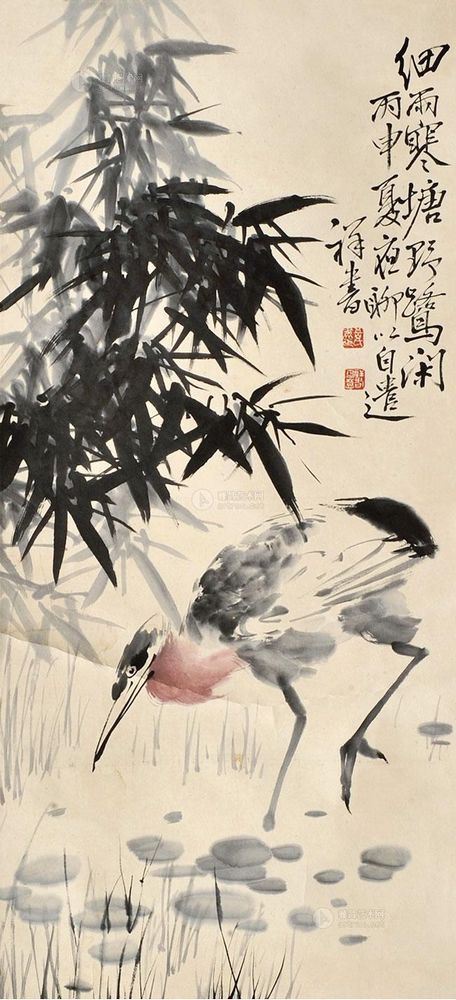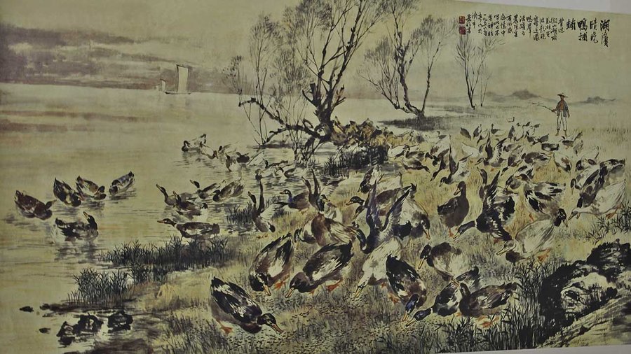 更难能可贵的是,他善于融通各家各派,广泛吸收各方面营养。作为一名富有天赋的艺术家,各种技法在他胸中经过自我点化,熔冶于一炉,在随手挥洒间,笔笔都是出自机杼。看他的水彩作品,安静,透明,用笔率性、轻松,色彩柔和,色调统一,树梢的线条灵活又稳健,看得出他的笔墨修养,但丝毫没有中国画中树法程式化的痕迹。同样,他在写意山水画中,不满足于简单的赭石、花青的渲染,而是巧妙地吸收了西画色彩的因素,使画面变得更为丰富。但是他的用线用墨又非常讲究,用纯粹的笔墨功夫表达了山水的意境。创作于1956年的《湖滨晴晓鸭捕蝻》,以写实手法表现微山湖畔鸭群捕虫的生动画面,嬉戏的鸭子姿态各异,角度多样,体现了画家敏锐的观察力和很强的结构写生能力。他在重视捕捉形的同时,运用笔墨的抑扬顿挫、轻重缓急,使笔下鸭子的神情、动态跃然纸上。当时的中国画坛,不少人在试图走中西结合的路子,但是成功的并不多,往往会出现这样一种情况:东方传统的元素拿到西方绘画里面,或者西方的元素放在东方传统绘画里面,二者不能融合,格格不入,不伦不类。而岳祥书先生却做到了东西方文化的有机结合,把写实技法熟练地运用在中国画的探索与发展的道路上,他走在了前面。