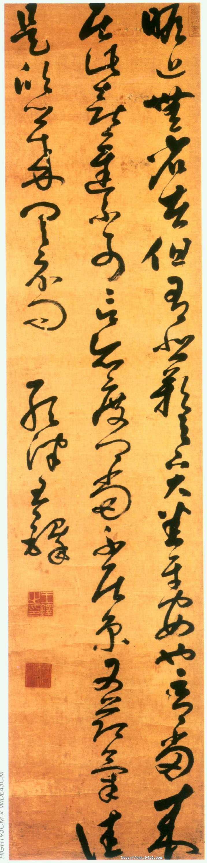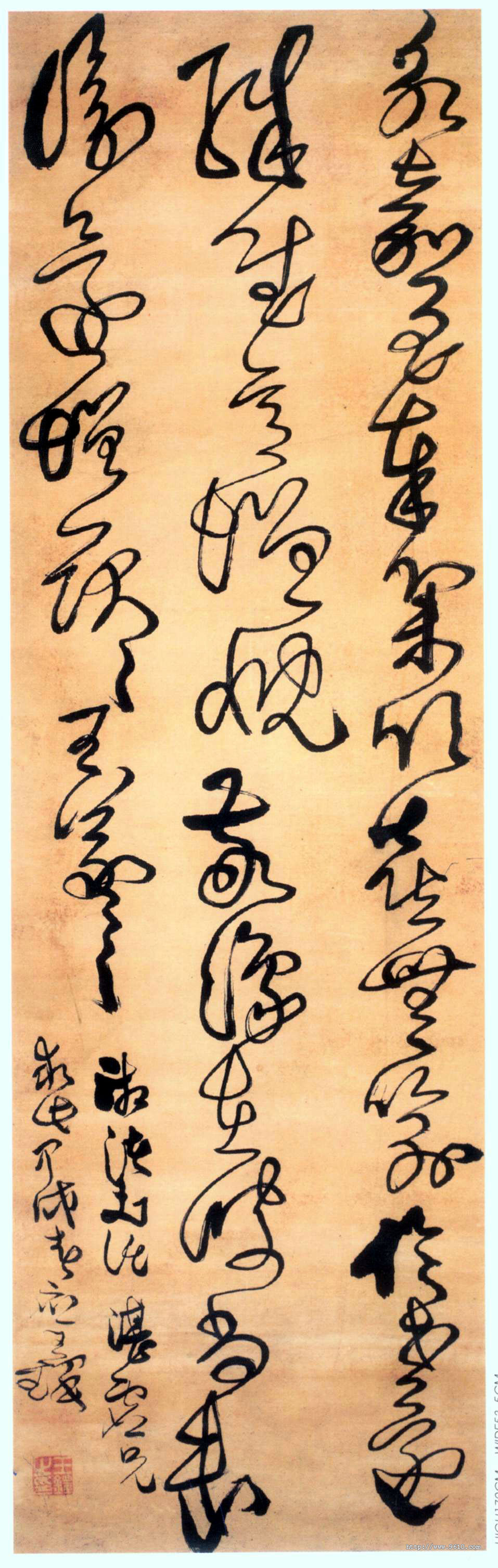 他在笔墨上的创新也是具有开拓性的,他的线条遒劲苍老,含蓄多变,于不经意的飞腾跳掷中表现出特殊个性,时而以浓、淡甚至宿墨,大胆制造线条与块面的强烈对比,形成一种强烈的节奏,不能不说他这有意无意之中的创举是对书法形式夸张对比的一大功绩。在他以前,还没有人能象他那样主动地追求“涨墨”效果。