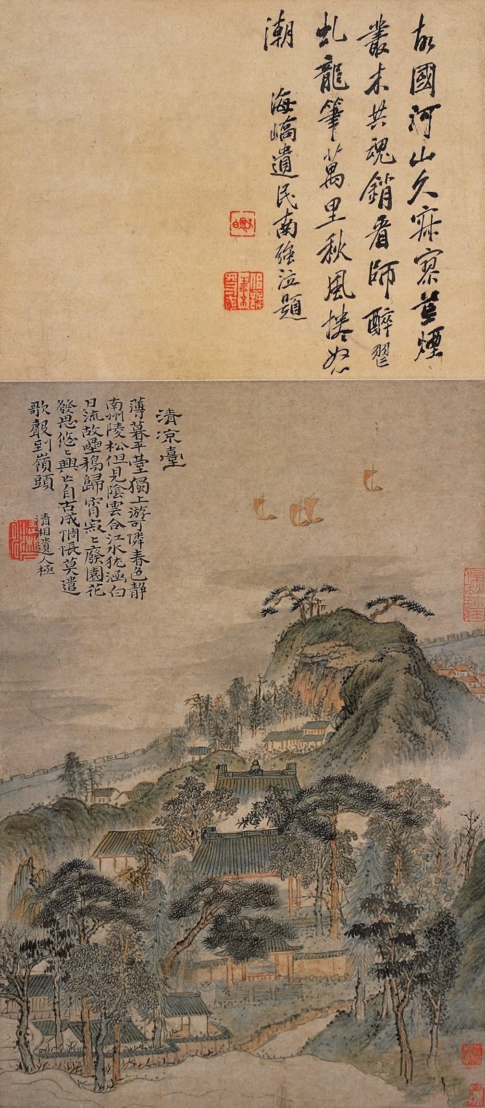 《清凉台图》丛簧小阁用干笔枯墨,有新安法派画风,远山用湿笔作云山,空灵碧透,墨气淋漓。整幅作品意境清逸冷峻,笔墨简练,虽寥寥数笔,随手挥写,但却点化成一片令人回味不已的幽美诗境。欣赏这幅清音阁图,细读画种题诗,更倍感画境之妙。