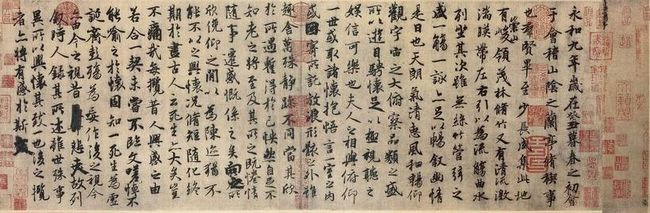 《兰亭序》共书324个字,全篇一气呵成,有如行云流水,潇洒飘逸,骨格清秀,点画遒美,疏密相间,布白巧妙,蕴含着极其丰裕的艺术美,全篇字的大小参差,长短相间,错落有致,点画皆映带相生,笔意相连,气脉贯通,字的结构富于变化,千姿百态,各具特色,法度俨然,整体气势从容不迫,充分体现了晋人”尚韵“的特色。