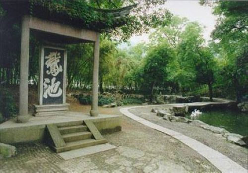 在兰亭里,有个方形的水池,池水清碧,白鹅戏嬉水面,池左旁有一座三角形的碑亭,亭内碑石上刻有“鹅池”两个草书大字。相传 “鹅池”两字为王羲之、王献之父子手笔,传说王羲之刚写完“鹅”字,欲书 “池”字时,忽闻圣旨到,遂搁笔迎旨。他的儿子王献之,趁父亲离开之际,提笔补上“池”字,一碑二字,一肥一瘦,父子合璧,成为千古佳话。