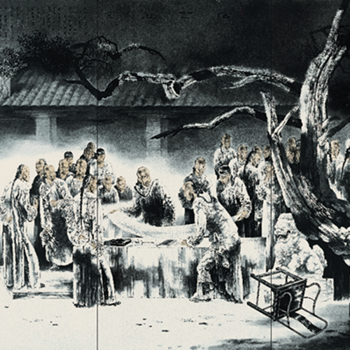 此幅作品在事件的叙述、人物的塑造、情节的安排等方面十分用心,尤其是把他擅长的人物造型拉长式表现,在局部的刻画中追求写意性,又在大写意的画面中进行精致的造型刻画。他通过大面积的墨色晕染来描绘一幅如此宏大的场景,让众多的人物形象仿佛同处于一个空间中,保证画面的整体感和统一性。因此,画面乍看是一个场景,实际上是多个场景的组合;乍看是一个事件,实际上是把一个事件分解成若干组镜头来表现。所以说,《公车上书》很好地解答了中国水墨画如何来表现历史性主题人物画创作的重要方法,成为了当代主题性创作中中西结合的经典之作。