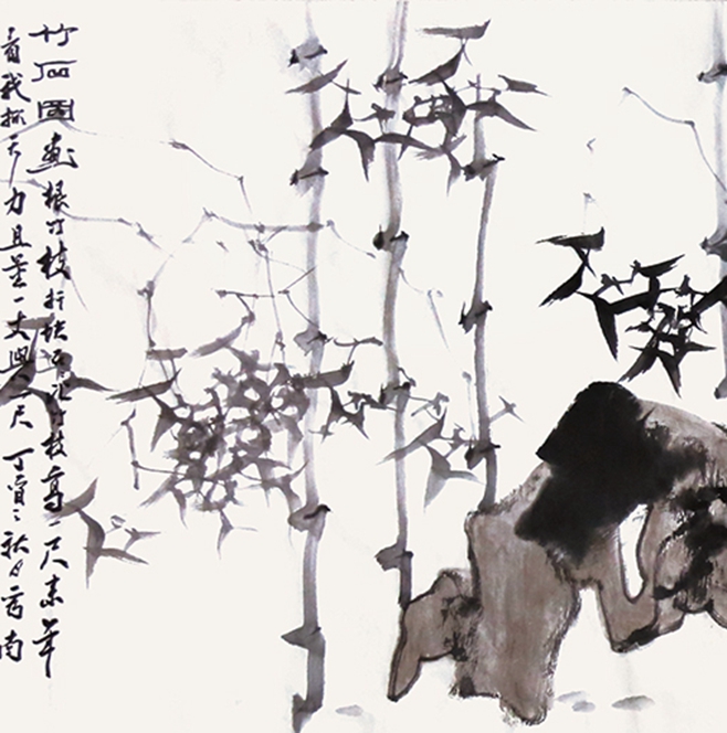 人物离不开其所生存的环境,孔维克深知人物画配景的重要。他一生最佩服的画家是任伯年,因他是一个花鸟人物山水全能的画家。孔维克作品多以各种花草、树石为人物画配景,都能恰到好处、相得益彰。虽然他所画紫藤、牡丹、芭蕉都有其自家面貌,但尤以画竹为佳,竹子看似极简极易画,却是极不易画好的题材。古今文人雅士均好此物,均爱写竹写兰,致使如今画竹者不胜其数,但多数面貌雷同。孔维克所画竹子,极具个人风格特色,他以书法汉简笔法融入写竹,以现代构成的抽象因素组合画面,作品潇洒脱俗,他应邀多届参加过全国花鸟画邀请展,亦颇受好评。