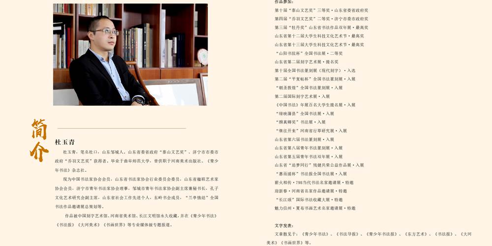 杜口微言,虚心养浩,书法学者李樯先生如是评价玉青。杜口,即少言。这是长辈对他成绩的阶段性赞许,也是长辈对后生的未来期望。此后玉青把此金玉良言奉为座右铭,同时笔名也改为杜口,谨遵长辈教诲,在对古典主义的谦恭接纳中杜口微言,在对现代意识的淡定创新中虚心养浩。