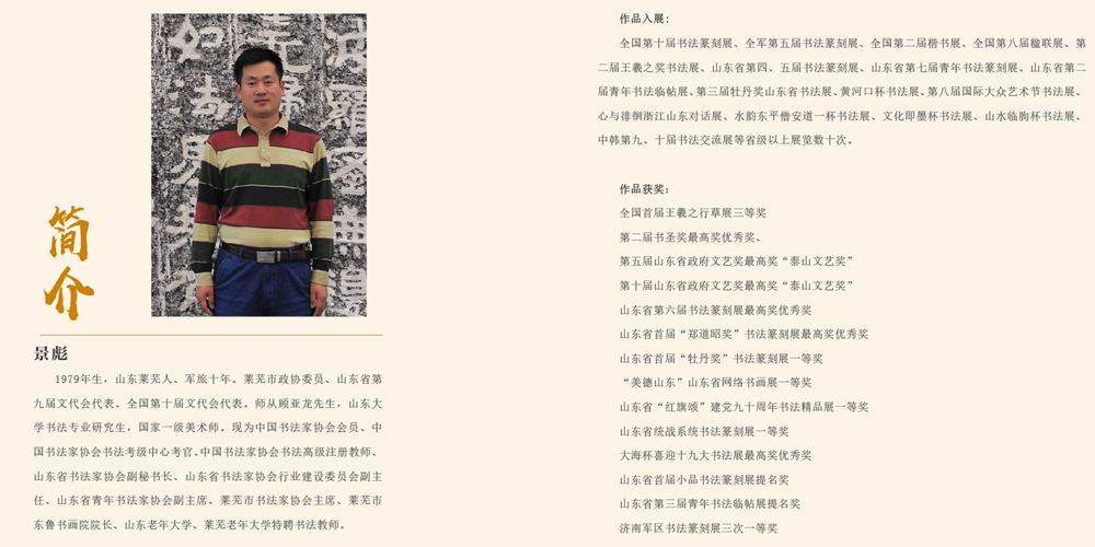 景彪,1979年生,山东莱芜人,军旅十年。中共党员、莱芜市政协委员、山东省第九届文代会代表、全国第十届文代会代表,师从顾亚龙先生,山东大学书法专业研究生。现为国家一级美术师、中国书法家协会会员、中国书法家协会书法考级中心考官、中国书法家协会书法高级注册教师、山东省书法家协会副秘书长、山东省书法家协会行业建设委员会副主任、山东省青年书法家协会副主席、莱芜市书法家协会主席、莱芜市东鲁书画院院长、山东老年大学、莱芜市老年大学特聘书法教师。