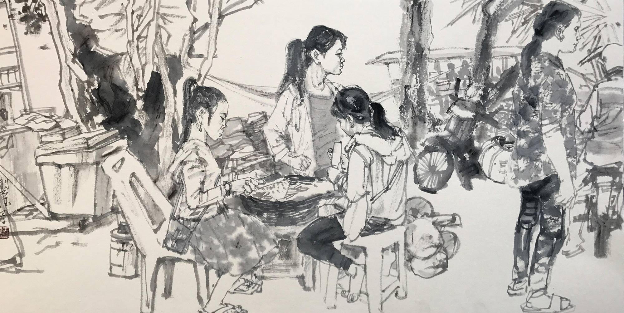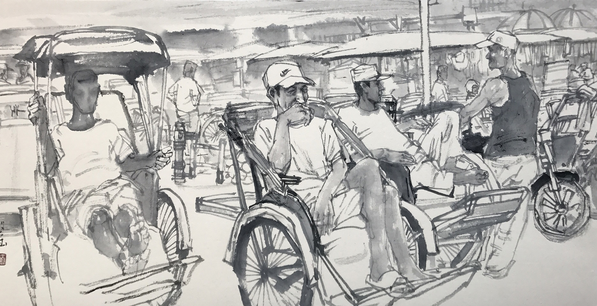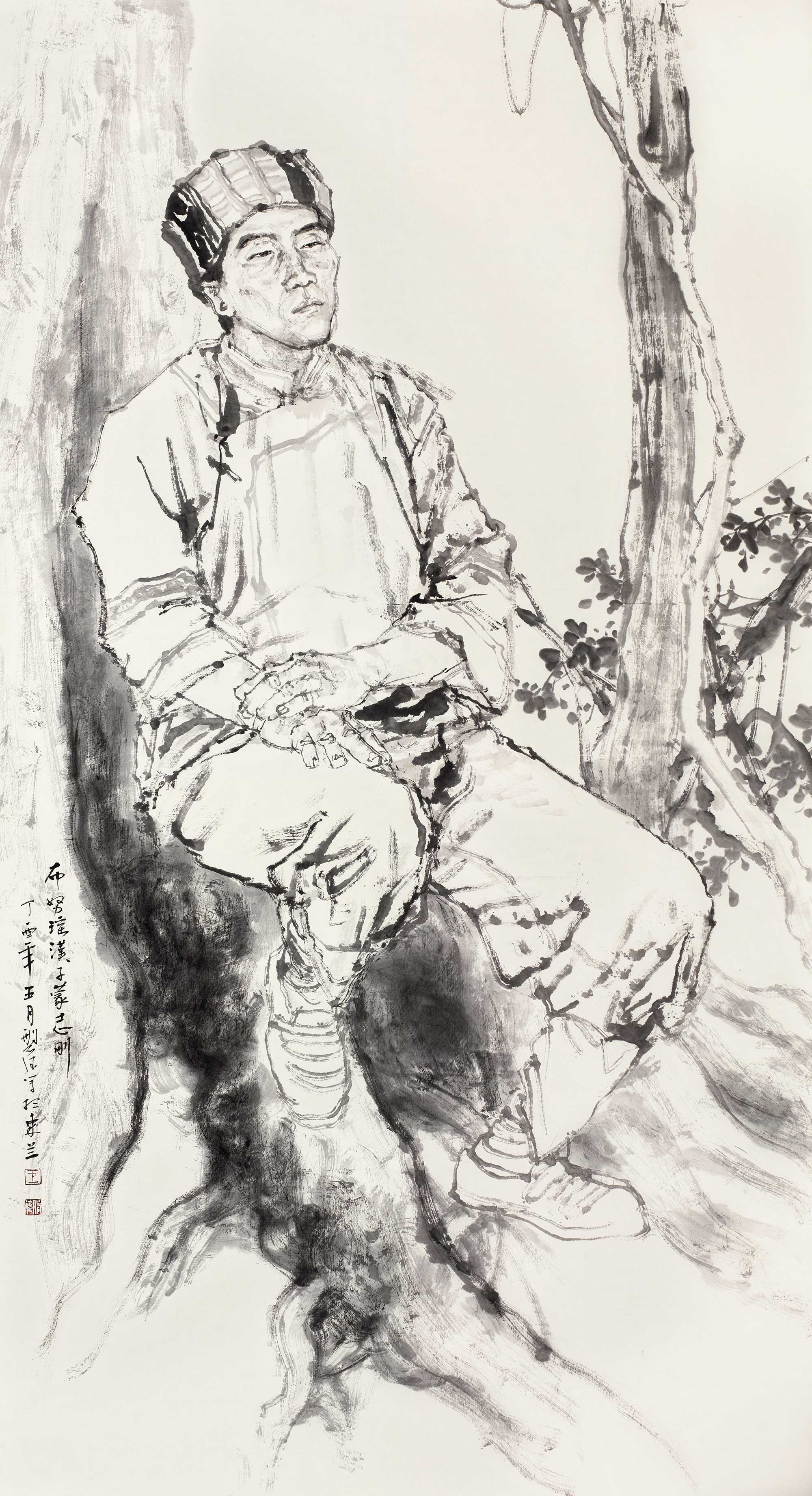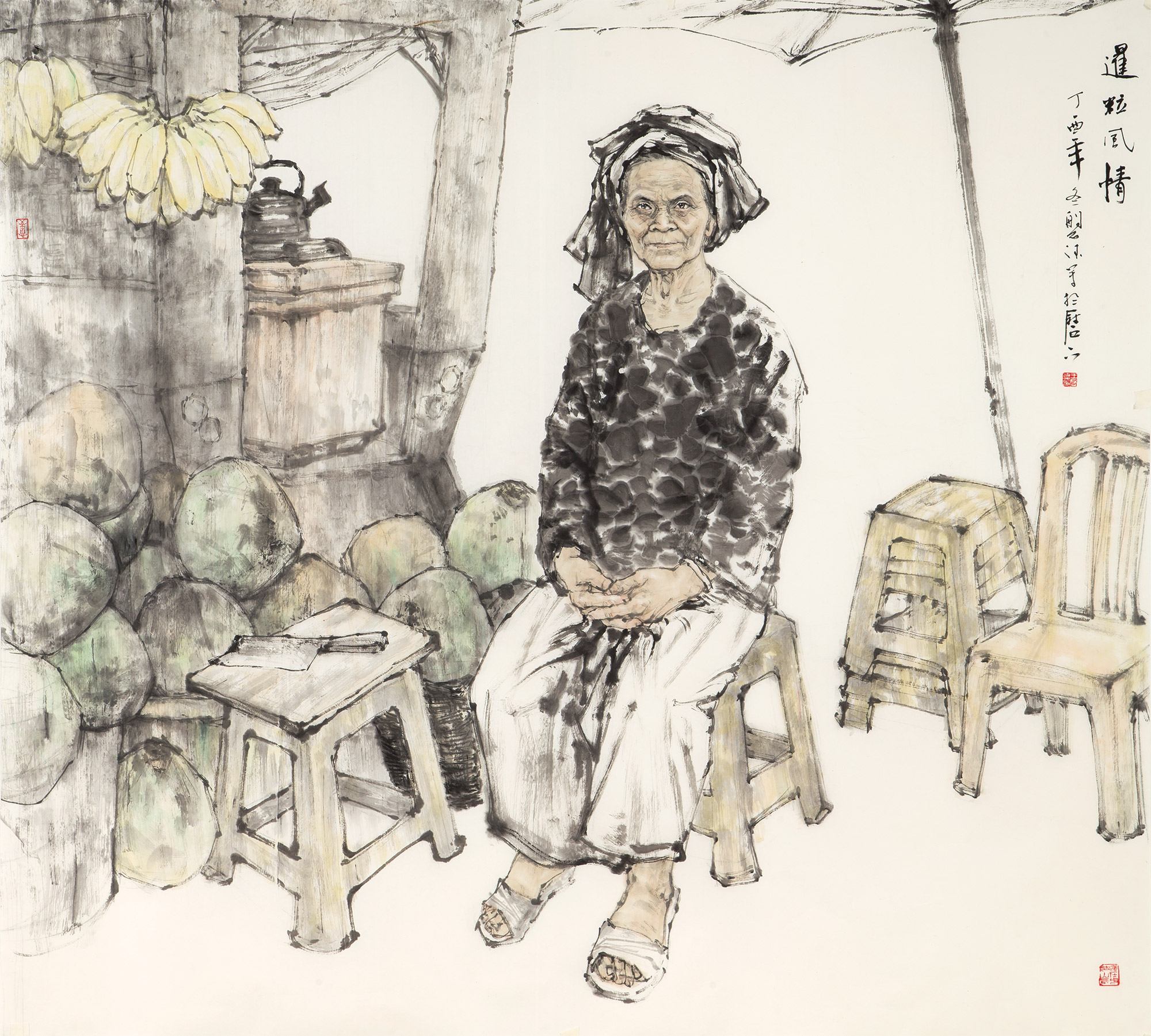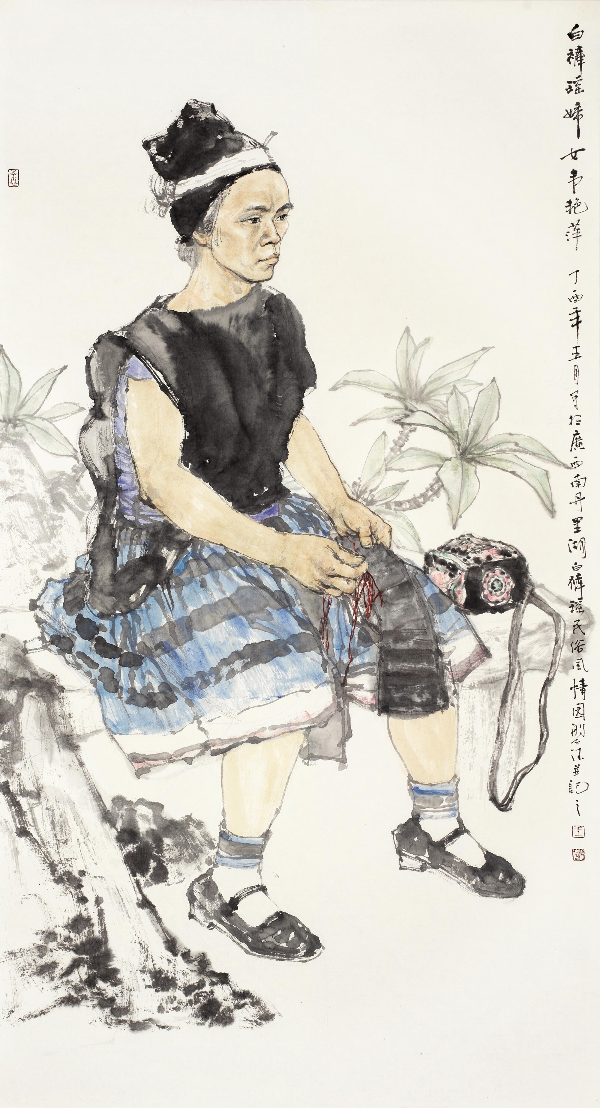 王磐德是美院出身的中国画家,他有两大特点,一是造型能力强,特别擅于写生,下笔轻重缓急,错落穿插,结构甚为紧密;二是生活气息浓,注意观察对象,善于捕捉人物转瞬即逝的表情,无论回眸一笑还是凝望注视或细细打量,总有一种意涵在内。在人物画领域,这也许是普遍的现象,但王磐德于此尤其突出,少有失误,其画之品格,与其人一样,朴实厚道,即古人曰厚德载物者是也。——郑工
