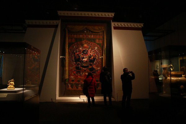 首博的一层B展厅为观众铺开了一条汇集北京、西藏、河北、重庆、青海五省区市21家文物收藏单位共216件(组)文物组成的“天路”,路边的玛尼堆指引人们走进雪域“圣地”,与藏族及藏族的历史文化亲密接触。