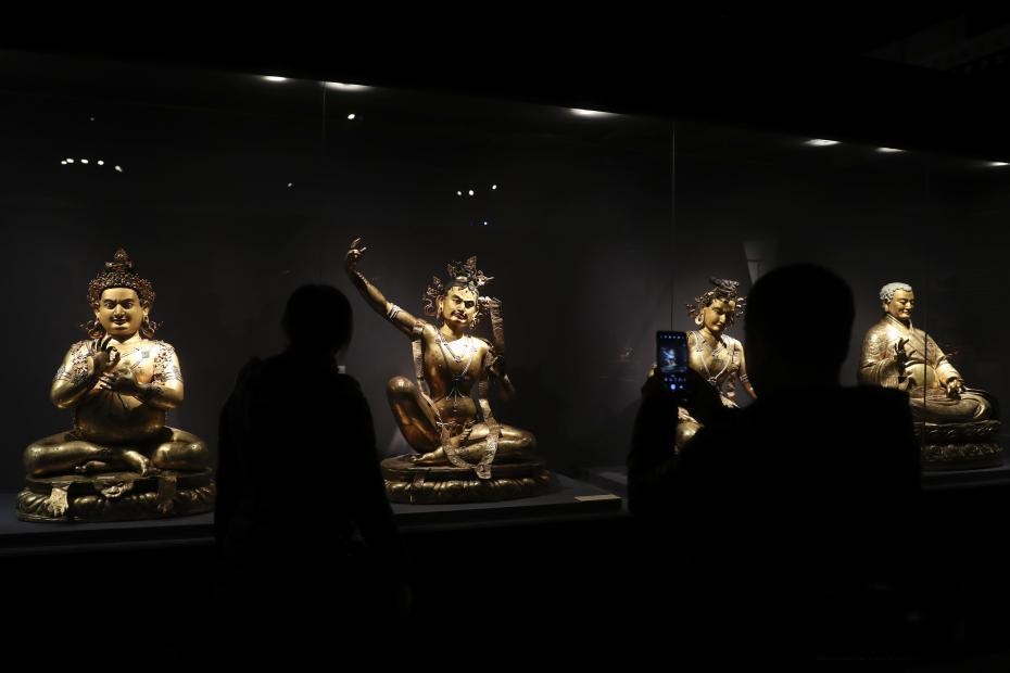 沿着“天路”前行,记者看到,西藏地区的对外交流范围不只局限在经济和政治,还有宗教、艺术等方面。合金释迦牟尼立像,螺发、高鼻梁、通体鎏金,其通肩袈裟衣纹呈U型排列,表现出湿衣贴体的效果,衬托出强壮的身体肌肉,这正是受到了犍陀罗艺术的影响。除中原造像艺术外,东印度帕拉造像、尼泊尔造像、斯瓦特造像、克什米尔造像,乃至新疆于阗的造像都对吐蕃佛教艺术产生过影响。首博展柜里的铜鎏金弥勒佛像,与人们熟悉的释迦牟尼像造型一致,底座上的铭文写明其为来自内地的弥勒,体现了吐蕃对内地文化的认同。此外,展品中还有金嵌珠宝檀香木唢呐,在藏语中称为“甲林”,是佛教活动中一种常用的管乐器。人们普遍认为甲林是内地唢呐传入西藏而后得名的。《布画天体日月星辰运行图唐卡》表现了黄道十二宫与节气的关系。黄道十二宫的推算起源于欧洲,后传入印度,又由印度传到中国的内地和西藏地区,促进了西藏历法的发展——显然,频繁而丰富的对外交往无疑对西藏地区宗教艺术、乐器、风俗、医药等方方面面都有深远的影响。