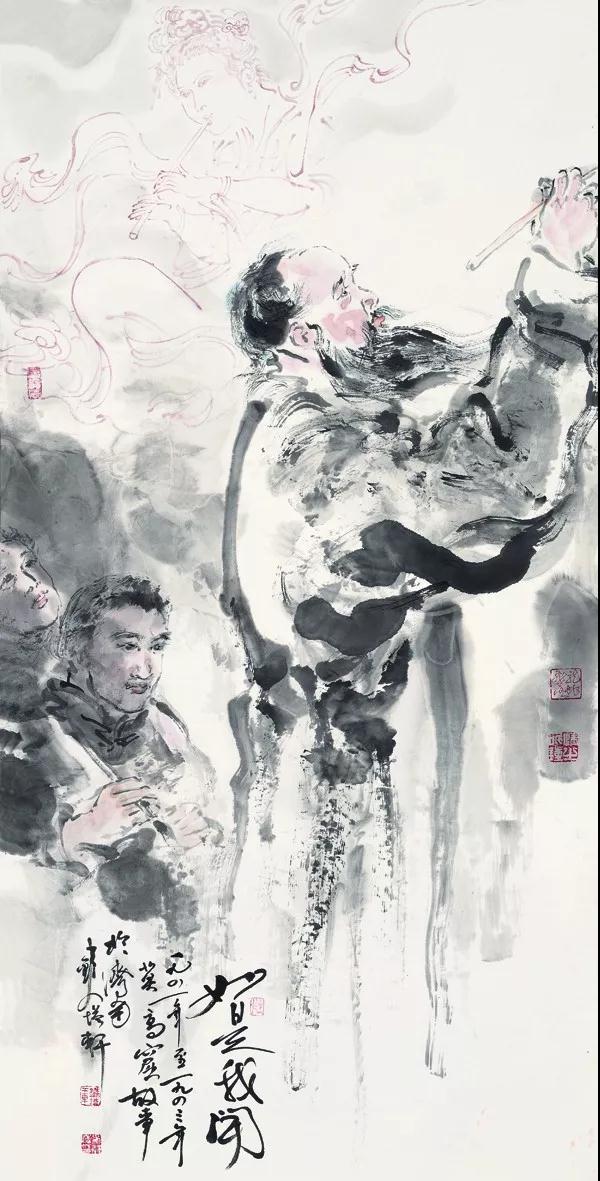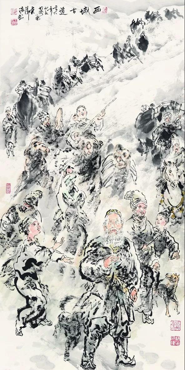 《远行敦煌》驼铃依稀;《西域古道》风沙漫卷;敦煌古城,一轮明月高照古今,敢问《今夕何年》?《月黑风高》,道士王圆箓与斯坦因等盗卖敦煌文物;《如是我闻》,张大千临摹敦煌壁画;《敦煌八景》色墨交融,重新诠释了敦煌的胜景。在敦煌这片土地上,古往今来的人物如张骞、卫青、霍去病、班超、张芝、林则徐、苏履吉,直至张大千、常书鸿、关山月、于右任等,栩栩如生地出现在吴泽浩先生的画面中。两汉之豪迈,盛唐之热烈,大漠之苍茫,佛国之神圣,都在画意诗情中得以真切的展现。那一笔一划的勾勒,那一墨一彩的色泽,那一韵一律的感怀,那一字一辞的虔诚,都淋漓尽致地呈现在“写意敦煌”里。“写意敦煌”,是情怀的抒写,是以虔诚、大爱、悲悯之心,传千年文脉,铺盛世华彩。