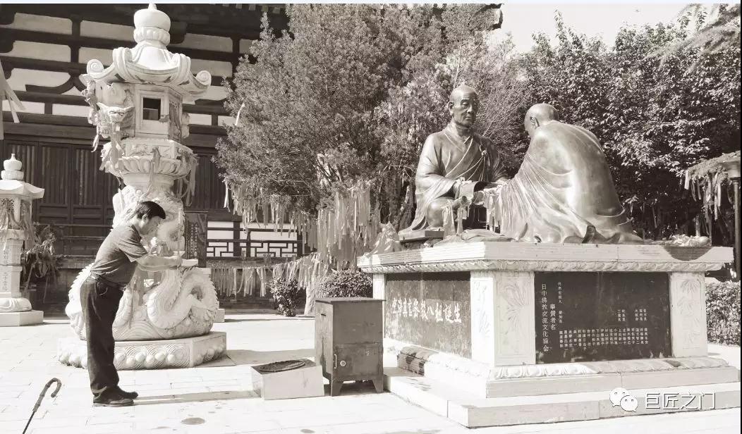 在青龙寺。千年前的遣唐史随行僧空海法师,就是在这里拜会果阿阇黎大师修禅,学习《密教流布长利众生》等大法,他携二百一十六部四百六十卷经书回国,后在日本高野山金刚峰寺创立了真言宗,并撰写了《秘密曼佗罗十住心论》等一系列的著作,除佛法外,还吸收中国文学、艺术、书法、绘画、建筑等,均有建树,成为日本真言宗开祖弘法大师,亦是日本影响巨大的佛教思想家。在空海圆寂1150年时,中日佛教界举办盛大纪念活动,青龙寺重新修葺,设“空海、惠果纪念堂”,并立“空海真言宻教八祖诞生像”,成为中日佛教史上的一段佳话。