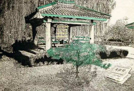 2011年9月,奥地利维也纳大学孔子学院赠与孔子研究院的友谊之树,松树四季常青,象征双方友谊天长地久。画面的中上部是一个亭楼,里面悬挂一口青铜钟,在其对面,超出画面之外,还有一个一样的钟亭,两钟铸满铭文,分铸《论语》上、下部,故合称《论语》钟亭。