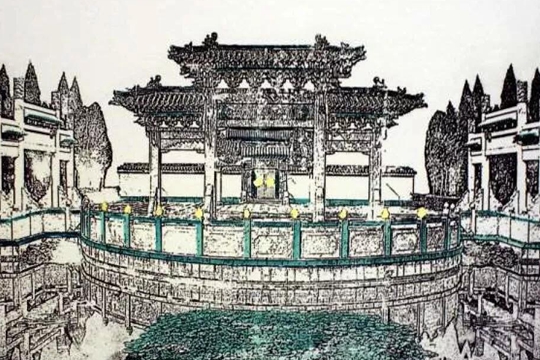 此图为孔子研究院的主体建筑——高台明堂,建筑共有四层,下两层为方形,上两层为圆形,正契合了中国“天圆地方”的传统理念,有招贤纳士、礼宾天下之意。高台明堂之南有一广场,名曰“辟雍广场”,有辟有雍,辟为玉璧,雍为流水,顾名思义,辟雍象征如玉美德、君子之风,如同流水连绵不绝,泽被苍生。