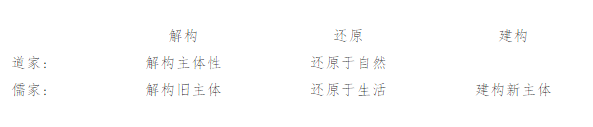 不过,儒家并非全然没有解构的观念。上文所引孔颜对话,虽是庄子创作的寓言,但确然与儒家思想不无相通之处。其一,在最抽象的意义上,儒道两家所谓“化”都是在讲人之存在状态的转变,两家追求的都是使现实中的人转变为理想中的人;其二,儒家对人的教化改造,首要的环节当然就是解构现实中的人,也就是说,为了树立新的主体性,首先得解构旧的主体性。由此可见,在“解构—还原—重建”这个建构序列中,儒道两家相同或者相通之处是在前面两个环节,区别只在最后一个环节:道家并不建构(也可以说回归自然真人也是一种建构),而儒家则是要重建社会人的主体性、以及作为社会规范及其制度的礼法秩序。如下: