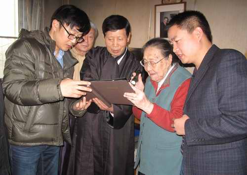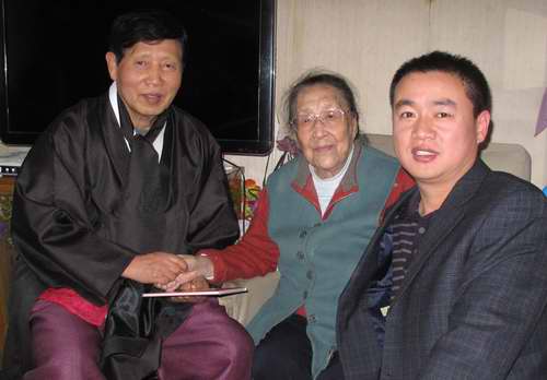 韩国客人看望孔德懋老人,右为中国孔子基金会驻京办主任杨光。