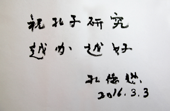 孔德懋老人听说今年是《孔子研究》创刊三十周年,为表示祝贺,孔老题写了“祝孔子研究越办越好”的寄语。孔德懋先生希望《孔子研究》的同仁们在基金会领导的指导和关心下,继续做好孔子文化的传播工作,越办越好。