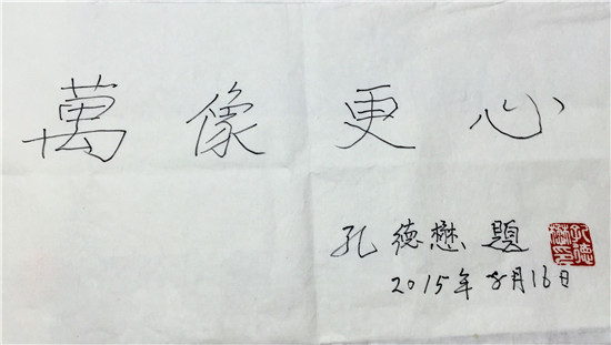 现场,孔老欣然命笔,为儒果孔子像题词:万像更心。她说,孔子像的普及,是更新,也是更心,更是耕心,我们的精神家园需要重构、需要耕耘!