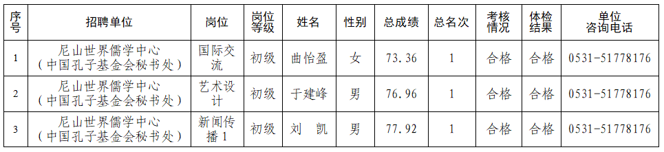 根据《中共山东省委组织部 、山东省人力资源和社会保障厅关于印发<山东省事业单位公开招聘人员实施办法>的通知》(鲁人社规〔2022〕2号)等相关规定,按照岗位招聘计划,尼山世界儒学中心(中国孔子基金会秘书处)及所属事业单位孔子博物馆组织进行了2022年公开招聘工作人员考试、考察、体检等工作,现对第一批拟聘用人员进行公示,名单如下 :