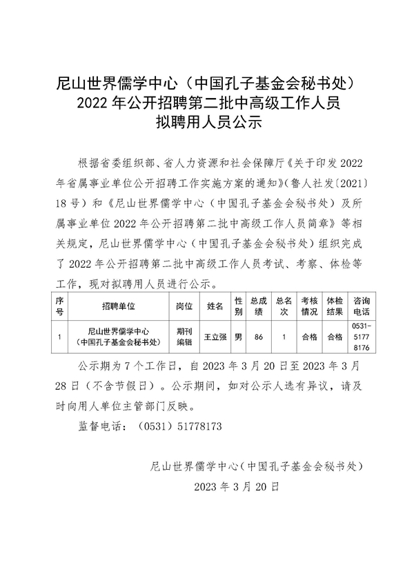 尼山世界儒学中心(中国孔子基金会秘书处)2022年公开招聘第二批中高级工作人员拟聘用人员公示