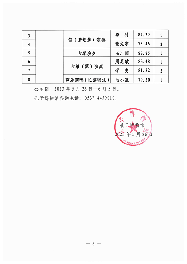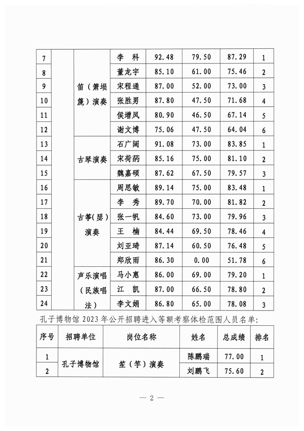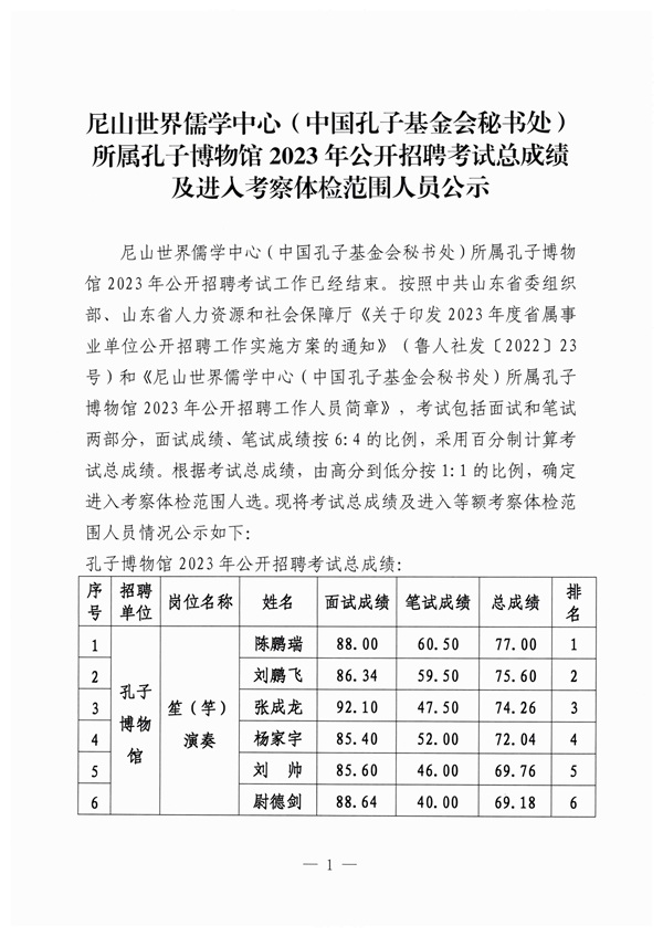 尼山世界儒学中心(中国孔子基金会秘书处)所属孔子博物馆2023年公开招聘考试总成绩及进入考察体检范围人员公示