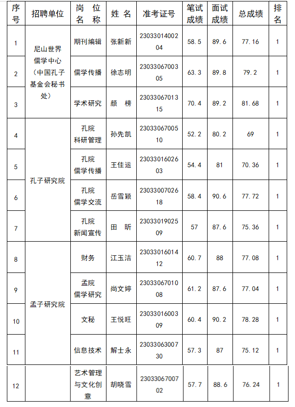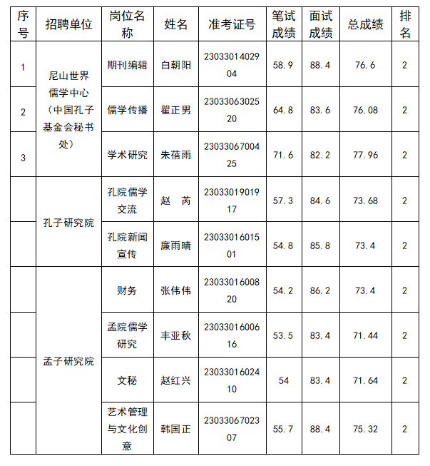 尼山世界儒学中心(中国孔子基金会秘书处)及所属事业单位2023年公开招聘初级综合岗位工作人员考察体检公示