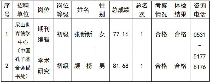 按照中共山东省委组织部、山东省人力资源和社会保障厅《关于印发2023年度省属事业单位公开招聘工作实施方案的通知》(鲁人社发〔2022〕23号)和《尼山世界儒学中心(中国孔子基金会秘书处)及所属事业单位2023年公开招聘工作人员简章》等相关规定,尼山世界儒学中心(中国孔子基金会秘书处)组织完成了2023年公开招聘工作人员考试、考察、体检等工作,现对拟聘用人员进行公示。