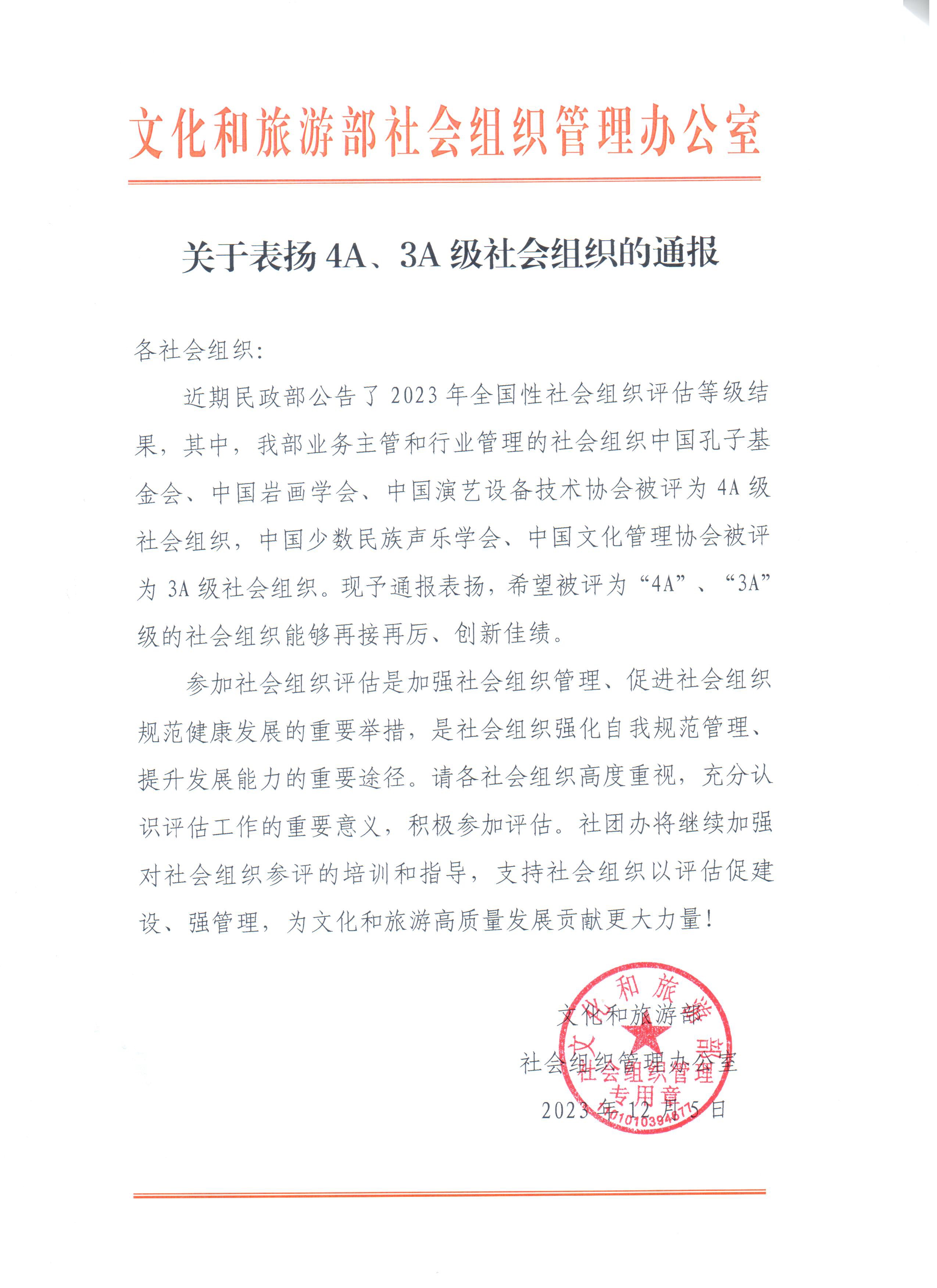 近日,民政部公告2023年全国性社会组织评估等级结果,其中中国孔子基金会被评为4A级基金会。文化和旅游部印发了《关于表扬4A、3A级社会组织的通报》,对中国孔子基金会予以通报表扬。