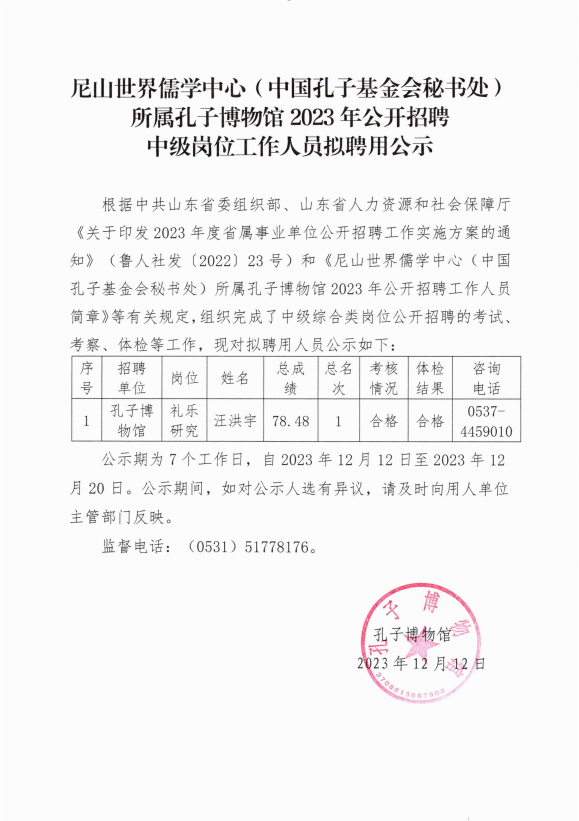 尼山世界儒学中心(中国孔子基金会秘书处)所属孔子博物馆2023年公开招聘中级岗位工作人员拟聘用公示