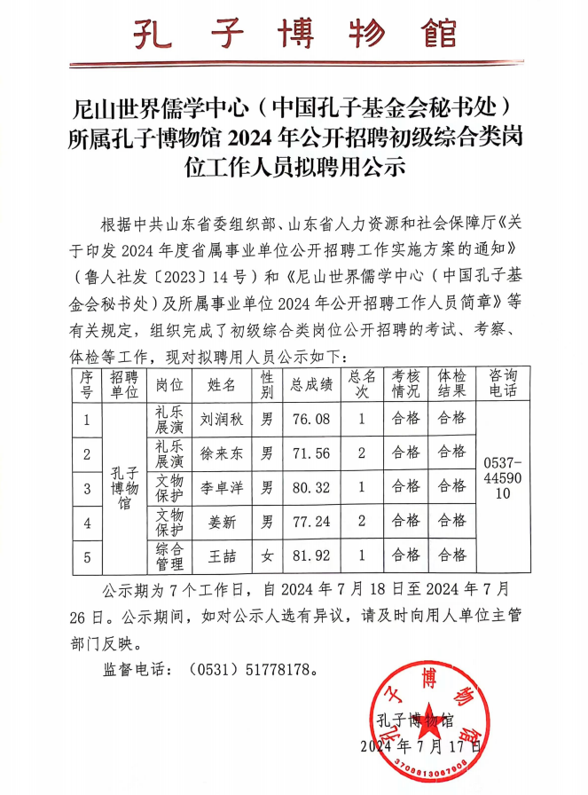 尼山世界儒学中心(中国孔子基金会秘书处)所属孔子博物馆2024年公开招聘初级综合类岗位工作人员拟聘用公示