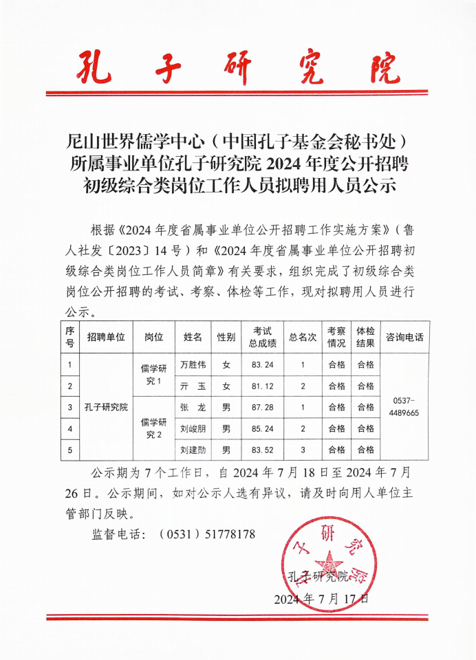尼山世界儒学中心(中国孔子基金会秘书处)所属事业单位孔子研究院2024年公开招聘初级综合类岗位工作人员拟聘用人员公示