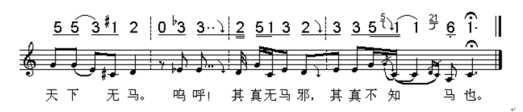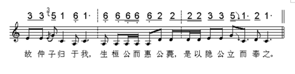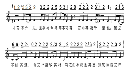 由谱例可以看出,古代散体文的吟诵方法以“读诵”为主,强调文气贯通;在语气舒缓或感情需要强调的句末、段末和文尾,以及虚字和感叹词处,则多用“吟”。另外,自程曦先生的吟例也可以看到,骈文由于其文体特点,在四六字句押韵,特别是平声尾字处,吟的成分增多。总的来说,吟诵古文,通常全篇以少数几个基本乐句重复或变化重复,不同的吟者会形成不同的“尾腔”。