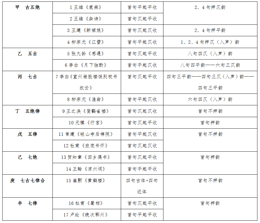 诗歌的吟诵与写作互为表里,由表3可以看出,赵元任先生所选吟诗的乐调十七例,全面而系统地展示了古体、近体八种诗歌体式的各种吟诵类型。赵元任先生在会议印发材料中也注明“6(1—8) in antique style of chanting poetry ;(9—17)in metric style of chanting poetry,except 6(15)which is a mixture of two styles”。(1—8)古体诗的吟诵;(9—17)除了15,都是格律诗的吟诵;15崔颢《黄鹤楼》是古体近体相混合的吟例。