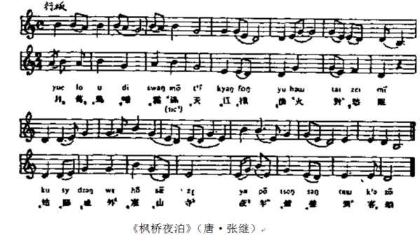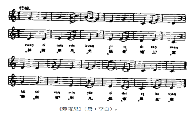 《赵元任年谱》记1956年,赵元任先生拟灌制《长恨歌》《琵琶行》录音带,几次试诵,总情不自禁、泣不成声,不能卒读而告终,而改录了其它一些短诗。之所以不能卒读,或因《长恨歌》等唐诗为母亲所教,与堂哥堂姐们跟随母亲读唐诗情景温馨,父母却在自己12岁时双双因病辞世。几首常州方言吟诵的短诗收于1956年出版的《国语入门唱片》,于该年刊出的《中国语言的声调、语调、唱读、吟诗、韵白、依声调作曲和不依声调作曲》一文中,赵元任也根据录制的吟例,用乐谱记下了李白《静夜思》和张继《枫桥夜泊》的两种吟诵方式(图4、图5):一般的吟诗调与私塾的唱读调。