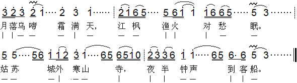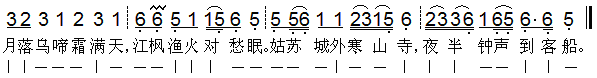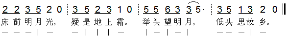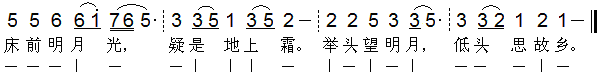 这两个谱例《静夜思》是五言古体,为古体诗;《枫桥夜泊》是七绝,为近体诗。两首诗,乐谱的第一行为对应诗句的吟诗调,第二行为读诗调即私塾里的唱读调,以简谱分别表示的话,《静夜思》的吟诗调为图6: