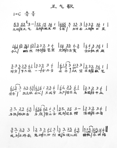 文天祥的五言古诗《正气歌》虽然篇目很长,但相比其他两首而言旋律却较为简单,流沙河先生的调子是每四句一个总体旋律,当一个部分的情感和意思表达完毕的时候,下一个部分又依照总体旋律开始吟诵,如此反复循环。《正气歌》四句一段,前四句由“so”起音,结束在“so”音上;第二个四句是“do”起音,结束在“do”音上,接下来罗列陈述历史人物和事件,从“时穷节乃见”开始旋律的调式发生了变化,从宫调式变成了羽调式。