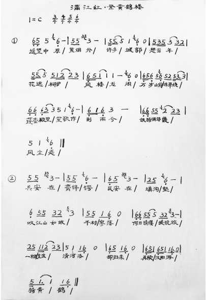 岳飞的《满江红·登黄鹤楼有感》为“羽调式”,属于色彩比较暗淡的调式,适合抒发较为伤感的情绪,表达岳飞对故国的忧思及收回河山的雄心壮志。虽然只有上下两阙,但每一句的旋律安排都不尽相同,在读法上不受平低仄高、平长仄短、模进对称的约束,这首词的旋律是三首诗词中最复杂最多变的,因而吟诵起来高低起伏、抗坠丰富。