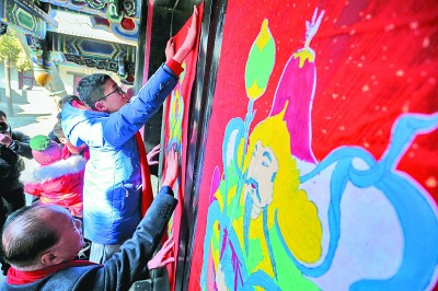 全国文明家庭孔令绍一家为孔府张贴门神。张清直摄/光明图片