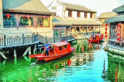 游客在山东省枣庄市台儿庄古城街道上漫步。孔闯摄/光明图片