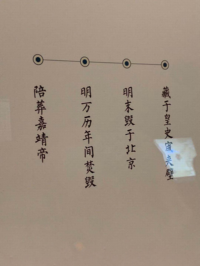 《大明世宗肃皇帝实录五百六十六卷》中记载了嘉靖帝着意重录大典,以备不测。其实《永乐大典》正本自永乐六年编修完成后,一直深藏禁中秘府,明朝皇帝大多并未直接使用过此书,史料中仅有弘治和嘉靖两位皇帝真正翻阅过《永乐大典》的记录。隆庆元年,《永乐大典》副本录毕之后,文献中几乎再难寻到有关永乐正本的记述,亦未曾发现正本实物存世。历史文献中曾记载过的《永乐大典》正副本曾收藏在哪里?