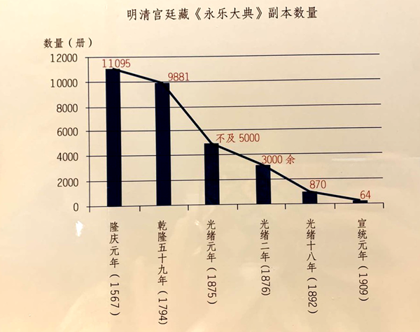 我们现在所搜集和看到的《永乐大典》都是副本体系中的。原11095册、22937卷(包含目录、凡例60卷)的嘉靖副本,截至目前仅有400余册、800余卷及部分零叶存世。国家图书馆共收藏《永乐大典》224册(其中62册现暂存于台湾地区),是《永乐大典》海内外最大藏家。明清时期《永乐大典》副本就散失严重。