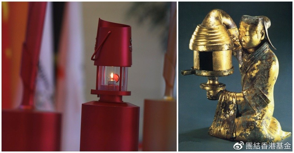北京冬奥会的火种灯,设计灵感源于长信宫灯(右),顶部设计好像飞舞的红色丝带,与火炬造型一脉相承。(图片来源:Getty,网上图片)