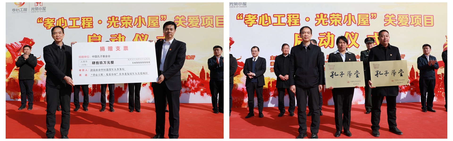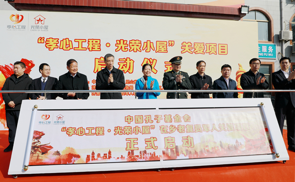 3月3日上午,由中国孔子基金会、尼山世界儒学中心、山东省退役军人事务厅共同发起的“孝心工程·光荣小屋”在乡老复员军人关爱项目在济南举行启动仪式。济南市委常委、济南警备区政委李鹏,尼山世界儒学中心(中国孔子基金会秘书处)党委书记、副主任,中国孔子基金会副理事长、秘书长国承彦,济南市市中区区委书记刘科,济南市退役军人事务局党组书记、局长韩延才,尼山世界儒学中心(中国孔子基金会秘书处)二级巡视员康承宝,济南市市中区副区长栾长征出席活动。尼山世界儒学中心(中国孔子基金会秘书处)党委委员、副秘书长邢成湖主持活动。