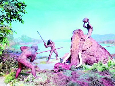 泥河湾盆地的古人类用石器和木矛猎杀大象的想象图 高星摄于泥河湾博物馆/光明图片