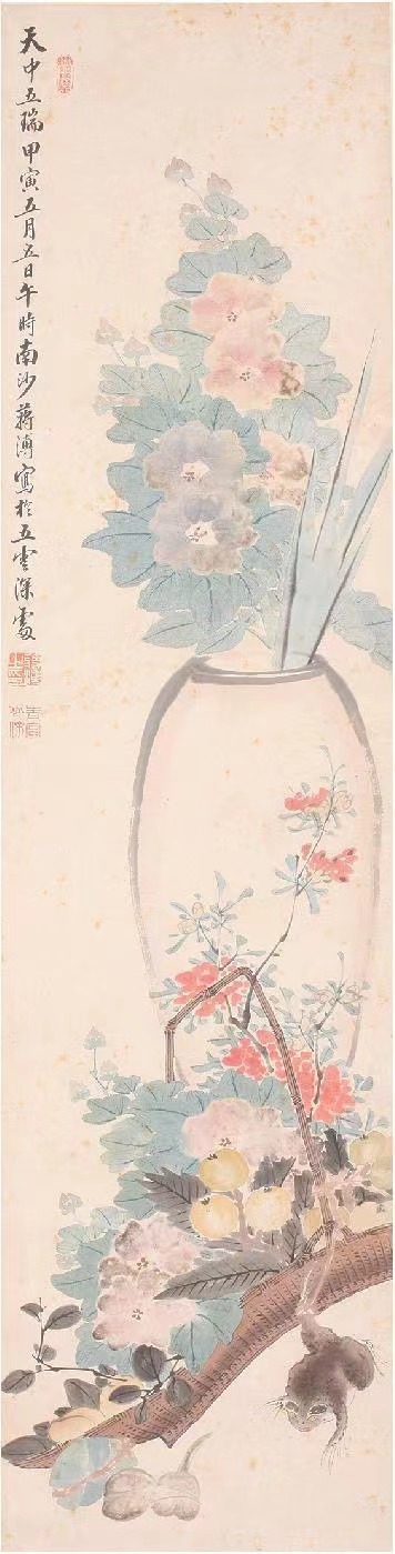 此图现藏于山东博物馆,长126.5厘米,宽30厘米,左侧题有“天中五瑞甲寅五月五日午时南沙蒋溥写于五云深处”。画中绘菖蒲、石榴花、蒜头、枇杷、蜀葵五种植物,正是五瑞。蓝、粉两色五朵蜀葵与四片菖蒲插于瓶中,石榴花、枇杷与数朵蜀葵置于篮中,石榴花枝娉婷而立,正好充当了素色花瓶上的纹样。篮边散落着两颗蒜头与一个粽子,提手上还绑着一只蟾蜍,这也是古人在端午“采杂药”时收集的药材之一。画家蒋溥为蒋廷锡长子,是蒋派花鸟画的重要代表人物,有“善墨花卉,书法亦妙”的评价。整幅画节令特征明显,构图精妙,用色淡雅清新,笔法细腻老到,实为佳作。