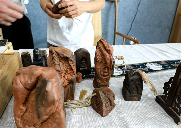 吴成坤在黄河澄泥陶印章上进行篆刻