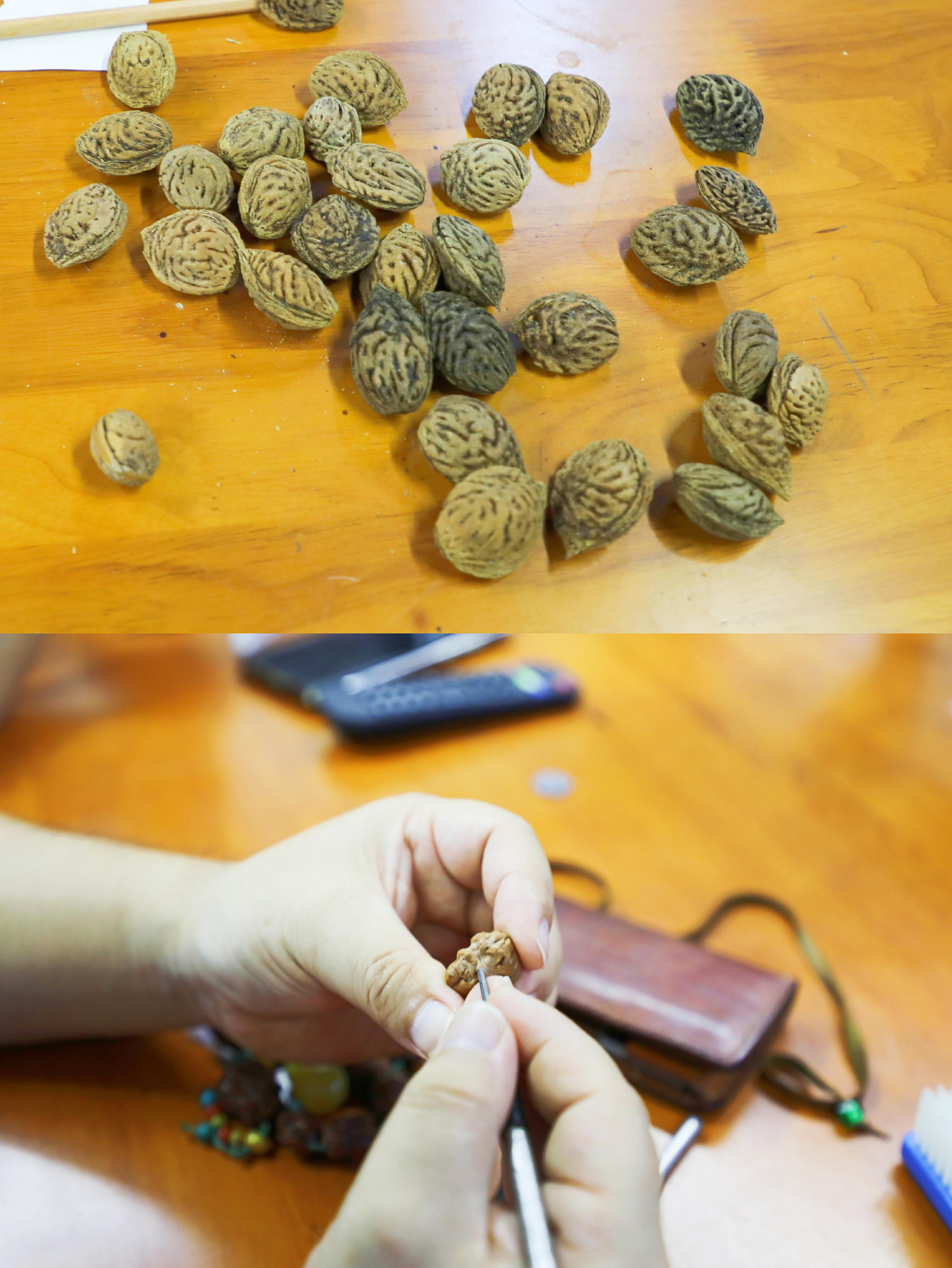 核艺堂学员正在雕刻桃核,桃核经雕琢变为方寸大小