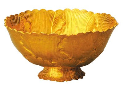 芙蓉花金盏是四川博物院的明星展品。金盏造型别致,好似一朵绽放的芙蓉花,檐口呈波浪状,盏身金光闪亮,花纹线条流畅。宋代象生花形金银杯、盏、盏托、盘等器皿造型丰富,有芙蓉花、菊花、栀子花、梅花、葵花等样式。据介绍,这种金盏多用作酒器。