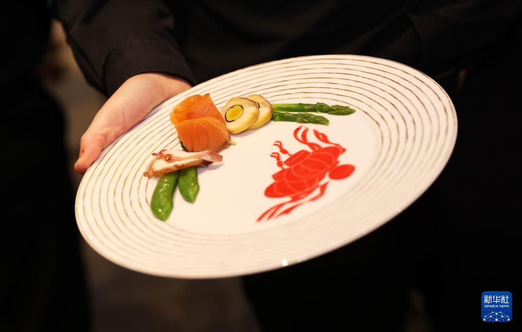 1月23日,中国驻法国大使馆在位于巴黎的联合国教科文组织总部举办“中法美食文化之夜”活动。这是活动中,工作人员端上佳肴。