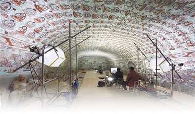 想将敦煌文物原原本本搬进电脑里,过程可不简单。“先要设计周密、完善的数字摄影采集方案,综合考虑洞窟大小、形状及损坏程度和摄影难度系数,对方案进行科学论证。然后使用定制轨道、摄影车等专业设备进行拍摄。最后运用拼接法,将上千幅原始图像拼接成一幅完整的图像。”走进第138窟,俞天秀指着正拍摄的设备说:“拍摄时,必须采用恒温冷光源,确保人为影响降到最低。”