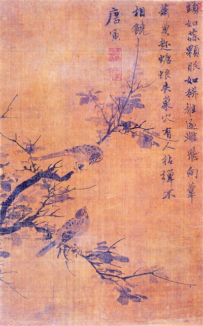 《椿树双雀图》是苏州湾博物馆的“镇馆之宝”。这是明代“吴门四家”之一唐寅晚年的佳作,为国家一级文物,原系吴江黎里寿恩堂周氏收藏。绢本设色,纵49.3厘米,横30.6厘米。全图以“院体”为本,兼融“文人画”意韵,工中有放,笔法娴熟,双雀刻画拟宋人笔法,工致精巧,呼应生动。椿树出枝似鹿角,流畅劲挺,树叶为水墨点厾而成,错落有致。图上有唐寅自题七绝一首:“头如蒜颗眼如椒,雄逐雌飞向苇萧,莫趁螳螂失巢穴,有人拈弹不相饶”。